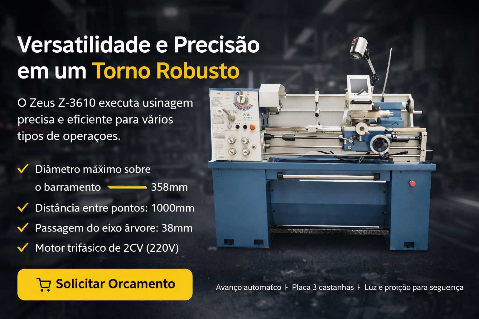 Torno Mecânico Zeus Z-1835 350 X 180 mm - Motor brushless 750 W /1 HP, engrenagens em aço!